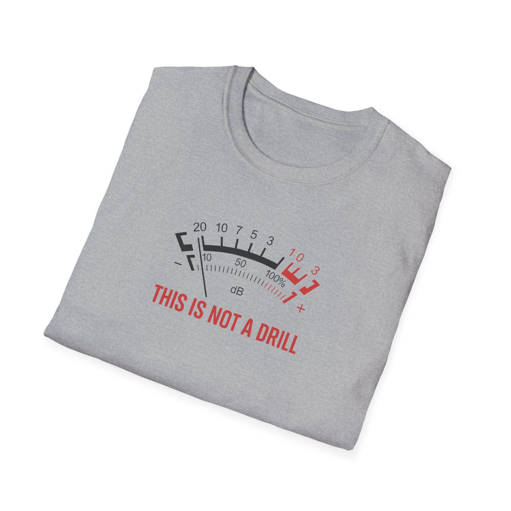 The "This Is Not a Drill" design is available in four classic colors: White, Light Blue, Sand (beige), and Heather Gray. Sizes range from S to 3XL for a unisex fit. We recommend checking our size chart for measurements—chest width and length—to find your perfect fit.