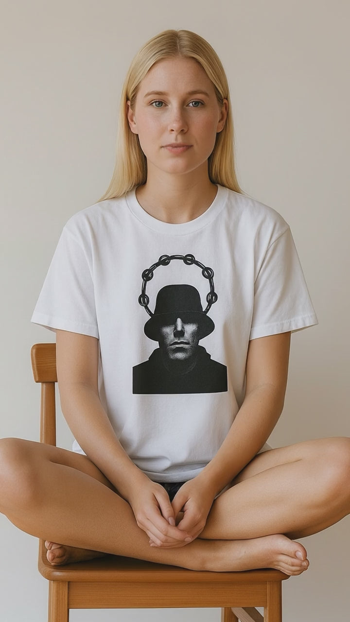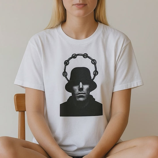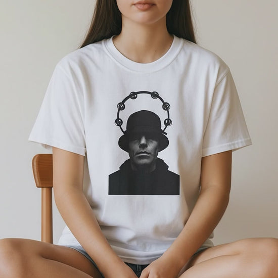 This Oasis-inspired t-shirt perfectly captures the essence of the Madchester swagger that shaped a musical generation. At the center is a bold black-and-white silhouette of Liam Gallagher, showcasing his iconic bucket hat, parka, and tambourine halo. This design highlights the unmistakable presence of the frontman with raw intensity and classic style. Crafted by On The Terrace, the graphic is printed using advanced DTG (Direct-to-Garment) technology. This method guarantees a crack-free, fade-resistant finish, bonding deeply to the fabric for long-lasting wear and vibrant color retention.