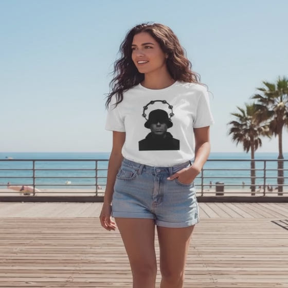 White Tee: This classic, muted backdrop evokes memories of smoky Britpop nights. The white colorway lets Liam Gallagher’s silhouette shine with unmatched clarity and impact, making it a striking piece in any wardrobe.
